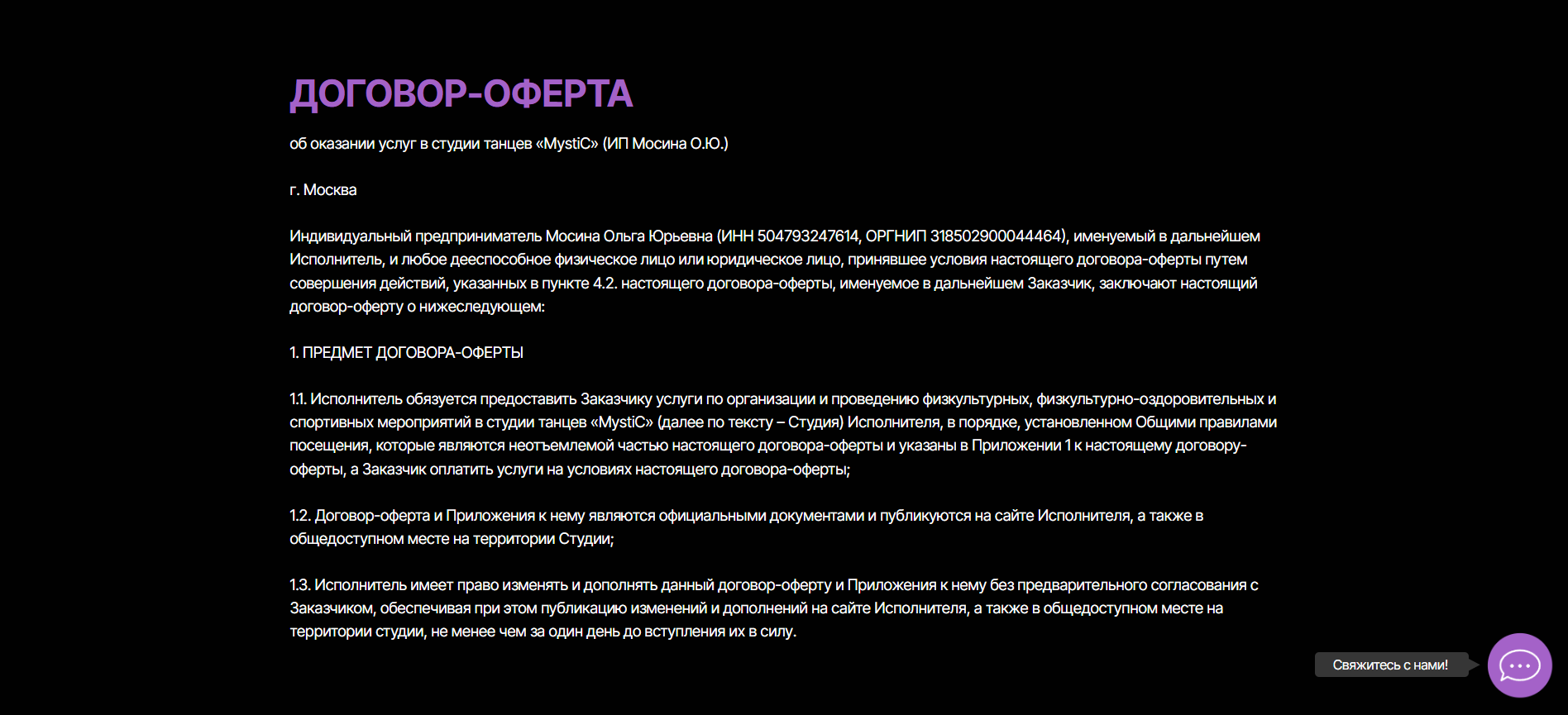 Индивидуальный предприниматель Мосина Ольга Юрьевна (ИНН 504793247614, ОРГНИП 318502900044464), именуемый в дальнейшем Исполнитель, и любое дееспособное физическое лицо или юридическое лицо, принявшее условия настоящего договора-оферты путем совершения действий, указанных в пункте 4.2. настоящего договора-оферты, именуемое в дальнейшем Заказчик, заключают настоящий договор-оферту о нижеследующем: