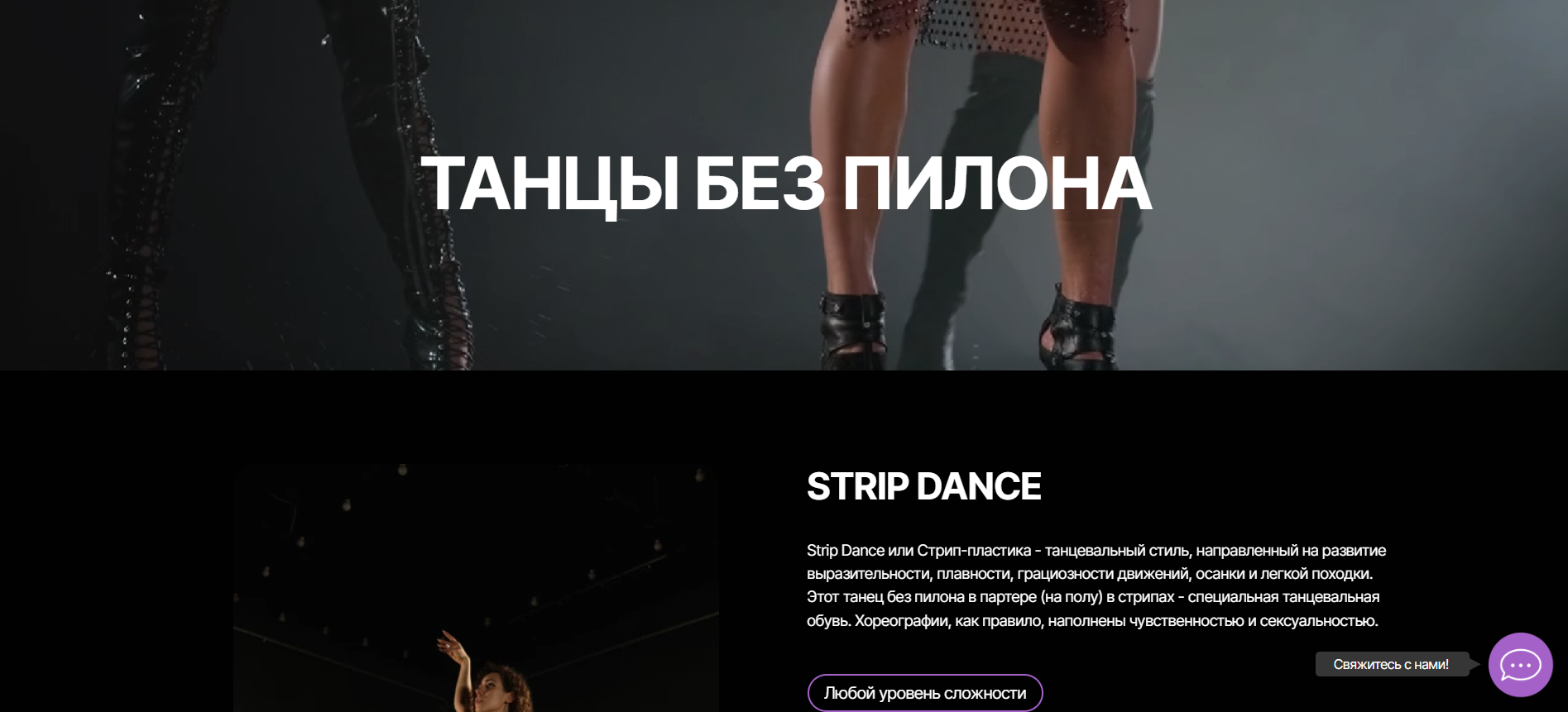 Strip Dance или Стрип-пластика - танцевальный стиль, направленный на развитие выразительности, плавности, грациозности движений, осанки и легкой походки. Этот танец без пилона в партере (на полу) в стрипах - специальная танцевальная обувь. Хореографии, как правило, наполнены чувственностью и сексуальностью.